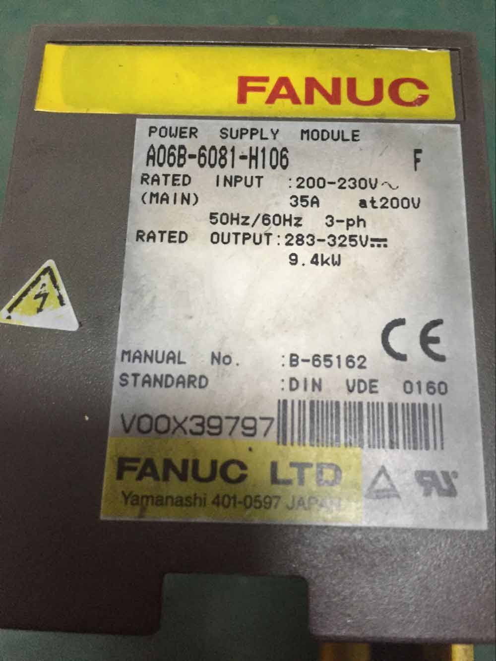 发那科电源放大器,型号为A06B-6081-H106,输入电压为三相200-230V交流50Hz/60Hz,最大电流35A;输出为283-325V直流,功率为9.4KW。