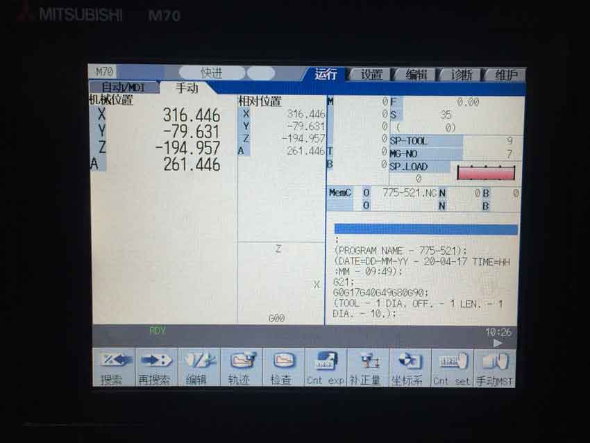 乔峰V-6数控加工中心出现无法启动故障,该加工中心为三菱MITSUBISHI M70系统,故障现象为打开总电源,按开机按钮,绿色开机按钮闪烁一下,马上熄灭。机床无法启动: