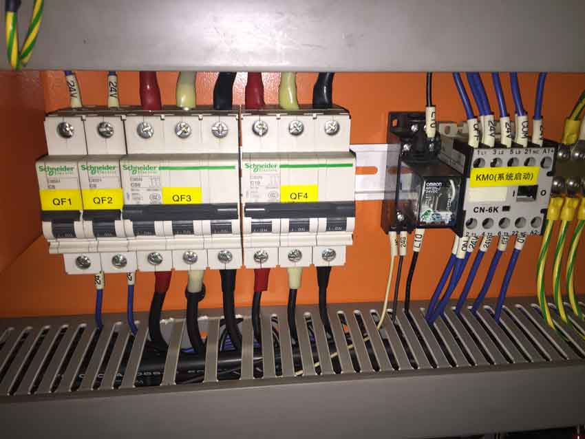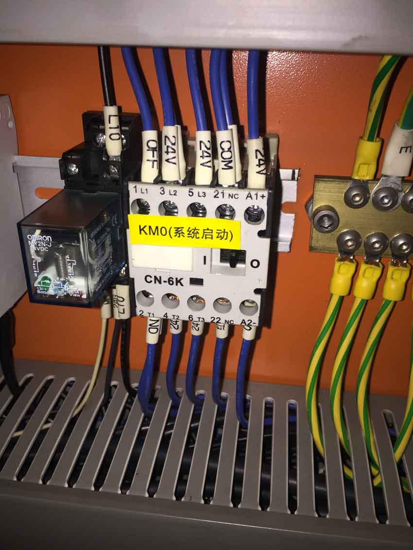 后检查电柜箱24V开关电源,24V供电正常,但是启动瞬间24V压降到17V左右,开关电源自动保护。测量发现启动继电器线圈KM0(系统启动)处24V和0V阻值只有1.0欧姆。拆掉24V后检查线圈阻值正常200欧姆左右。于是关掉24V电源空气开关QF1、QF2,该加工中心使用了两块24V电源。24V空气开关共有两个,关掉后发现短路情况依旧。